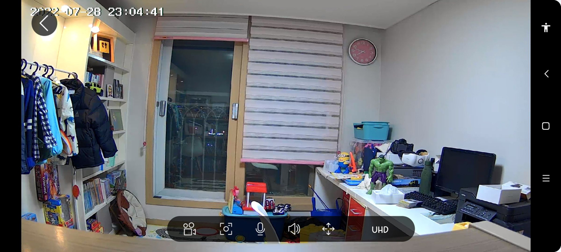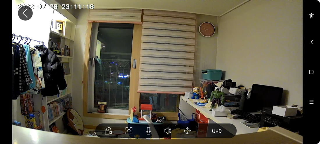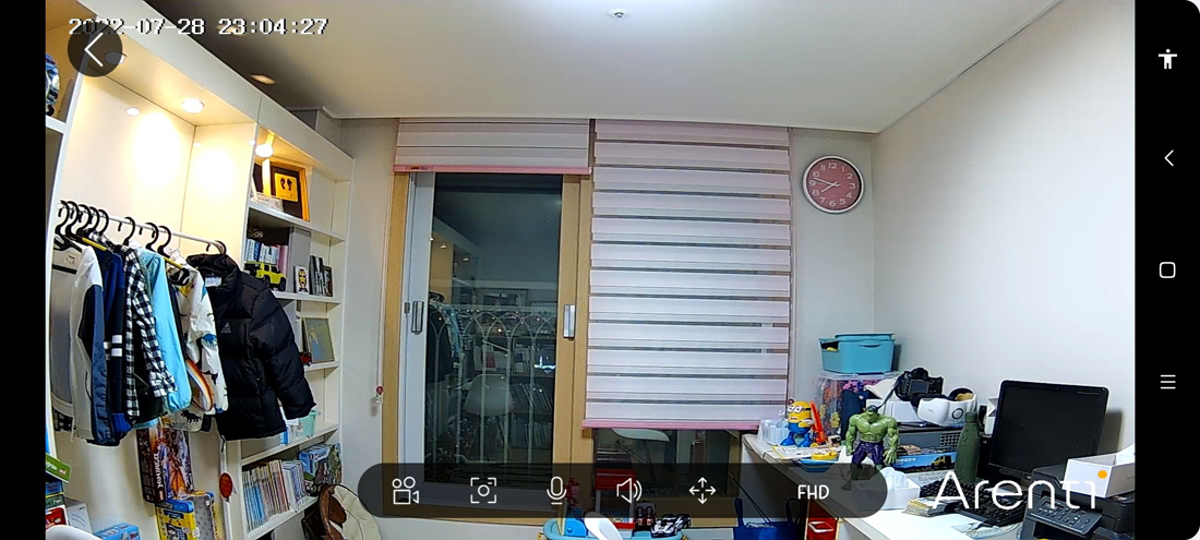 이번에는 Arenti DOME1 사진입니다. 풀HD와 UHD 화질이라는 차이점을 갖고있지만 실제 스트리밍 영상에서는 큰 차이를 확인할 수 없었습니다. SD 메모리카드에 저장된 촬영영상이나 클라우드로 업로드 된 영상은 화질에 차이가 있을 것으로 예상되나, 실시간 영상에서는 큰 차이는 보이지 않습니다.