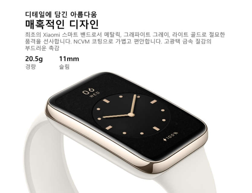 11mm의 얇은 두께에 20.5그램의 가벼운 무게. 곡선 디스플레이까지 군더더기 없는 예쁜 디자인을 갖추고 있어, 깔끔한 디자인을 찾는 여성분들에게도 추천합니다.