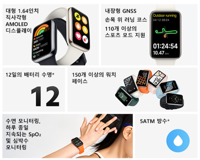 또한 미밴드7 프로는 GNSS가 탑재되어 보다 빠른 위치파악을 지원하고, 러닝을 비롯한 운동모드에서 보다 정확한 운동 경로를 추적할 수 있게되었습니다. 스마트워치의 기본 기능인 수면모니터링이나 심박수 측정은 당연히 탑재되어있으며, SpO2라는 혈중 산소포화도도 측정 가능합니다. 110가지 이상의 스포츠모드를 지원해 각종 운동시 편리하고요. 5ATM 방수기능도 탑재되어있어 생활방수는 물론 운동으로 인한 땀으로 고장이 발생할 일은 전혀 없습니다. 다양한 기능이 탑재되어있음에도 불구하고 배터리는 12일이나 지속되므로 더욱 편리하죠.