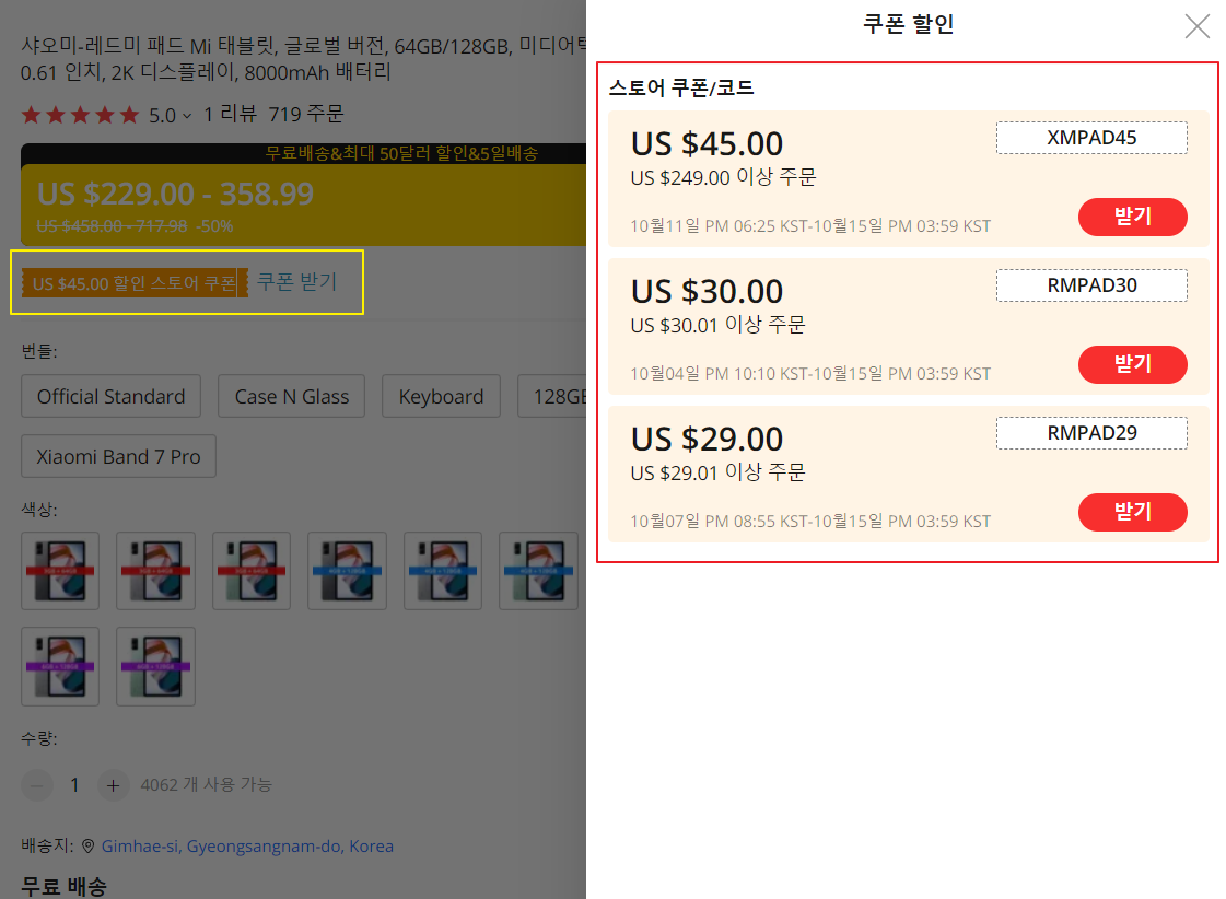 위 사진처럼 판매가격 아랫부분의 스토어 쿠폰받기 버튼을 클릭하면, 할인 쿠폰을 다운로드 할 수 있습니다. 현재 기준 249달러 이상 45달러 할인이벤트가 진행되고 있으니 보다 저렴하게 구입이 가능합니다. 45달러 쿠폰 할인을 받기위해서는 RAM 3GB+64GB 제품은 적용이 안되므로 옵션에서 4GB+128GB 이상인 제품을 선택하는걸 추천합니다. 자세한 내용은 아래 링크를 참고하세요!