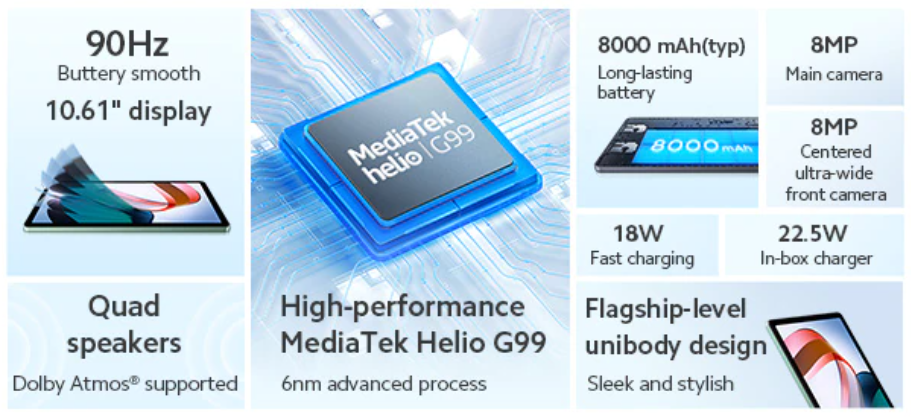 6나노공정의 미디어텍 헬리오 G99 프로세서가 탑재된 홍미패드는 최대 6GB RAM과 128GB 내장메모리를 지원하는 태블릿입니다. 무려 8000mAh나 되는 대용량 배터리가 탑재되어 오랫동안 사용 가능하며, 18W 퀵차지도 지원합니다.