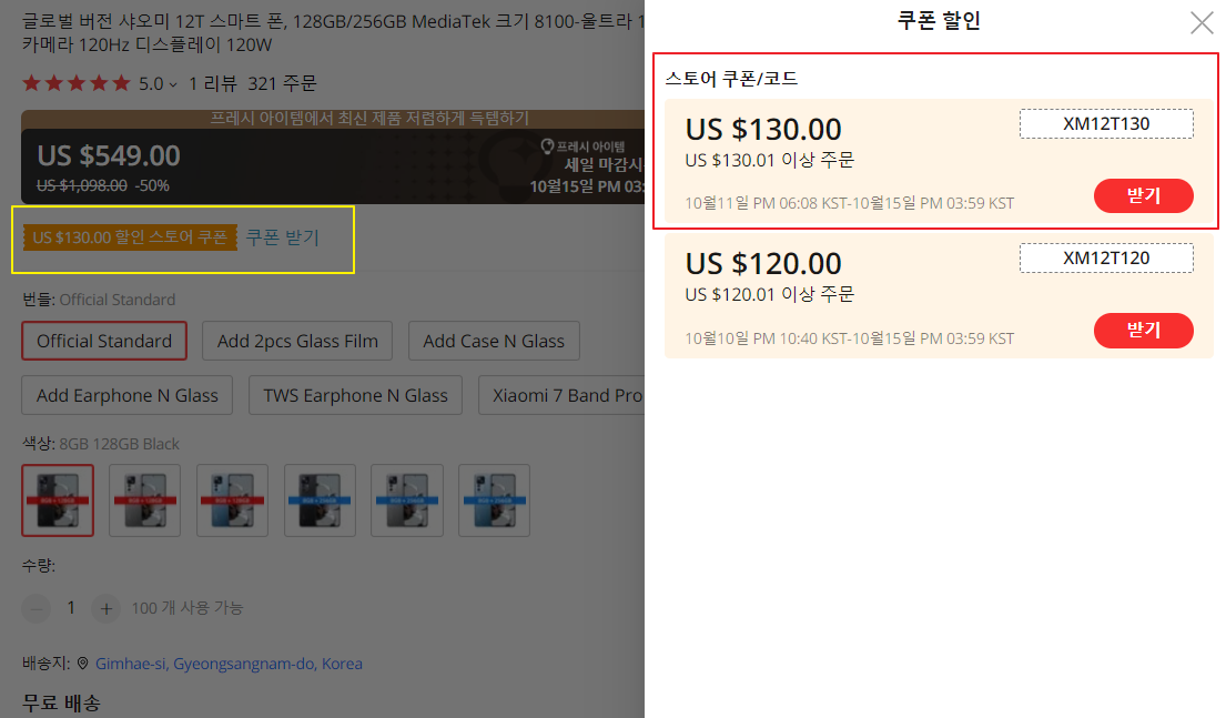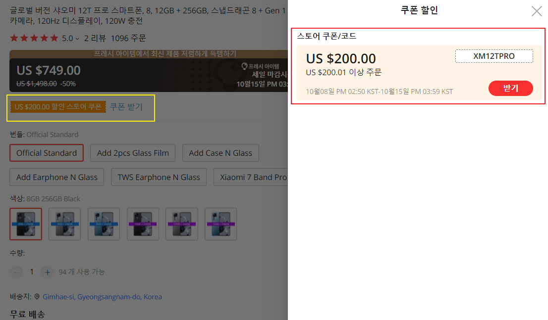 최고 성능을 발휘하고 싶다면, 샤오미 12T 프로를 추천합니다. 알리익스프레스 공식 셀러가 무려 200달러 할인쿠폰을 지급하고 있는데요.