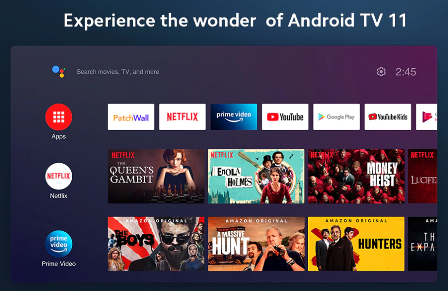 USB동글을 꽂아주기만하면 안드로이드TV 11 운영체제의 스마트 TV로 변하게되는데요. 넷플릭스나 유튜브, 아마존 프라임 비디오를 바로 볼 수 있습니다. 2.4GHz와 5GHz 와이파이를 지원하며 4K로 스트리밍이 가능합니다. 스피커로 잘 알려진 브랜드돌비 Atmos를 지원하고요. 구글 어시스턴트가 내장되어있어 리모컨 외 음성으로도 조작이 가능합니다.