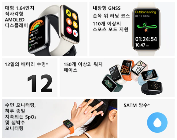 배터리는 한번 충전시 무려 12일동안 사용이 가능합니다. 150개 이상의 워치페이스를 지원해 원하는 스타일로 매일매일 다르게 적용할 수 있고요. 110개 이상의 스포츠모드와 5ATM 방수기능까지 탑재했기때문에 수영을 비롯한 수상 스포츠를 좋아하시는 분들에게도 추천합니다.
