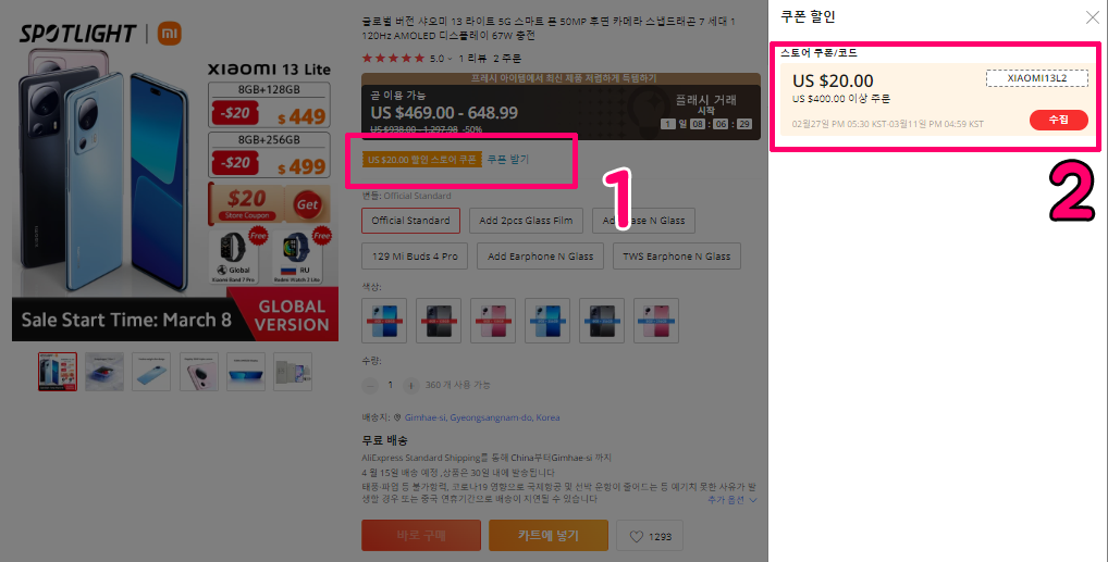 현재 알리익스프레스에서 샤오미13 라이트 글로벌버전 출시기념으로 얼리버드 할인이벤트를 진행하고 있는데요. 20달러 추가할인 쿠폰도 사용이 가능합니다. 얼리버드 할인이벤트는 3월 8일 오후 5시부터 진행되며, 선착순으로 경품 지급이벤트도 진행하고 있으니 아래 링크에서 확인해보세요!