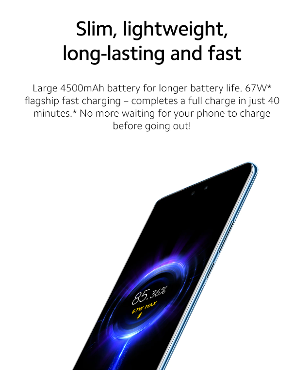 또한 카메라 응답성이 크게 향상되어 찰나의 순간을 놓치지 않도록 Lightning Burst 기능을 통해 여러장의 사진을 빠르게 촬영할 수도 있습니다. 배터리는 4500mAh 대용량 배터리가 탑재되어있으며, 67W 고속 충전을 지원해 40분이면 100% 완충이 가능합니다.
