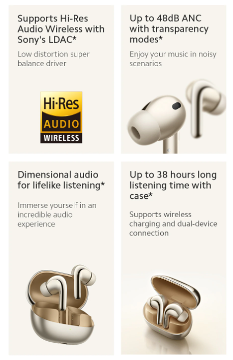 ANC(액티브 노이즈 캔슬링) 기능이 탑재되어 최대 48데시벨의 시끄러운 곳에서도 외부소음을 차단할 수 있어 온전히 음악에만 집중할 수 있게 만들어 줍니다. 또한 다양한 상황에서의 주변 소음을 지능적으로 식별하는데, 3가지의 노이즈 캔슬링 기능을 자동으로 전환해줍니다. 특히 바람이 많이 부는 경우에도 이를 식별하고 소음을 억제하게 만들어 준다고 하는데요. 6가지 수동 액티브 노이즈 제거 모드도 있으므로 상황에 맞게 설정해 사용할 수도 있습니다.