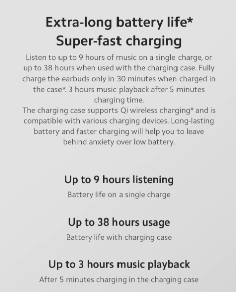 샤오미 버즈 4 프로는 초고속 충전과 매우 긴 배터리 수명도 특징인데요. 이어버드는 53mAh 배터리가 내장되어 있으며, 한번 충전으로 최대 9시간동안 음악을 들을 수 있고, 충전 케이스는 565mAh 배터리가 탑재되어있어 최대 38시간 동안 사용이 가능합니다. 이어버드는 케이스에 넣으면 30분에 100% 충전이 되는데, 5분만 충전해도 3시간동안 음악 감상이 가능합니다. 배터리가 다 떨어졌을때 정말 편리하겠죠? 그리고 충전 케이스는 USB-C타입 케이블을 이용해 충전할 수 있으며, Qi 무선 충전도 지원합니다.