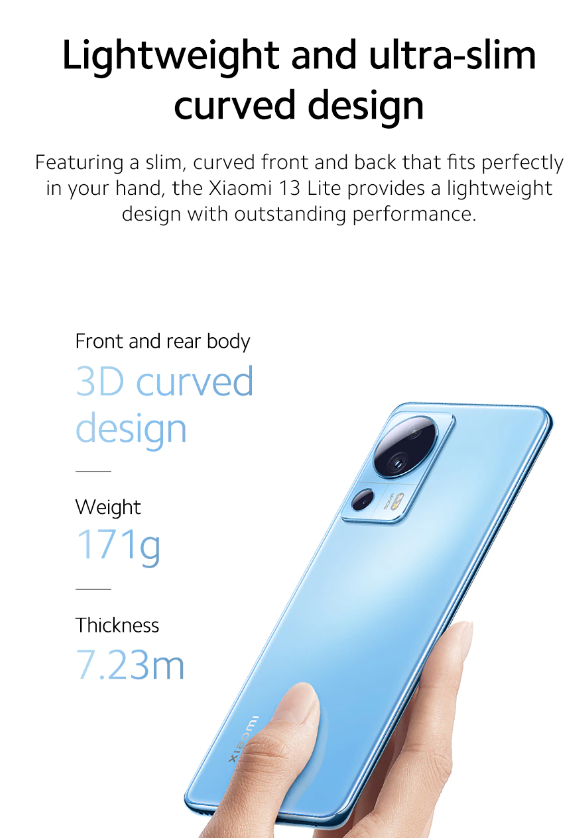 샤오미 13 라이트는 라이트라는 이름에 걸맞게 두께는 7.23mm, 무게는 171g으로 가볍고 얇은 두께를 지닌 제품입니다. 6.55인치 커브드 디스플레이로 넓은 시야 영역을 가지고 있으며, 후면디자인 또한 3D 커브드 바디 디자인으로 제작되어 편안한 그립감을 느낄 수 있는 제품인데요. 색상은 라이트 핑크와 라이트 블루, 블랙으로 출시되어 3가지 색상 중 선택이 가능합니다.