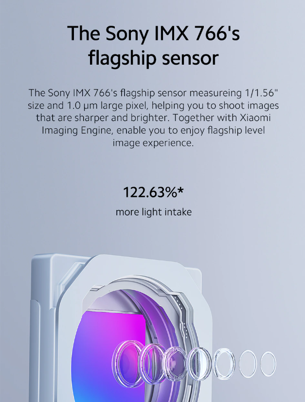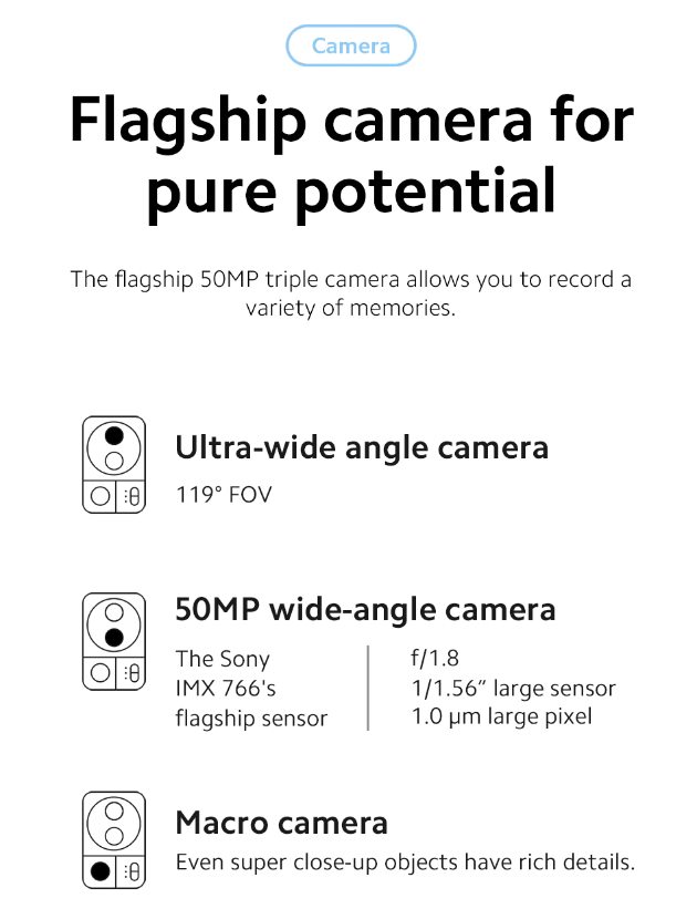 후면 카메라는 5000만 화소의 메인카메라와 800만 화소의 초광각 카메라, 그리고 200만 화소의 매크로 카메라가 탑재된 트리플 카메라 구성으로 Sony IMX 766의 플래그십 센서가 탑재되었습니다. 소니 IMX 766의 플래그십 센서는 1/1.56 "크기와 1.0 μm 픽셀로 더욱 선명하고 밝은 이미지 촬영이 가능합니다.