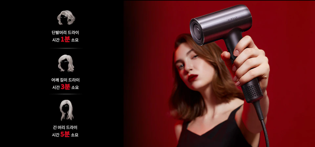 남성이나 단발머리 여성의 경우 젖은 머리를 말리는데 고작 1분밖에 걸리지 않으며, 중단발의 경우 3분, 긴 머리의 경우에도 5분밖에 걸리지않아 아침에 출근준비나 외출준비 시간을 크게 줄일 수 있습니다.
