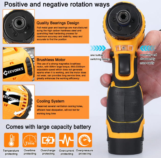 55Nm의 파워풀한 토크와 1500rpm의 빠른 회전속도를 갖추고 있으며, 브러시리스 모터가 탑재되어있어 고장없이 오랫동안 사용이 가능합니다. 일부 저가형 제품은 브러시드 모터를 사용하기때문에 쉽게 고장이 나는데, 이 제품은 가격도 저렴한데 브러시리스 모터가 탑재되어있기때문에 가성비가 매우 좋다고 볼 수 있어요. 또한 메탈기어와 베어링은 고탄소강과 열경화 공정을 통해 생산되어 내구성이 뛰어나 안정적인 성능을 보장하고 있습니다.