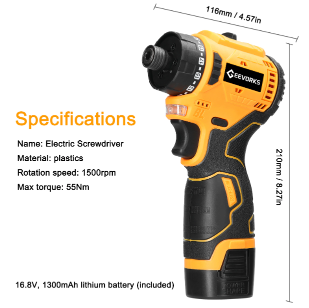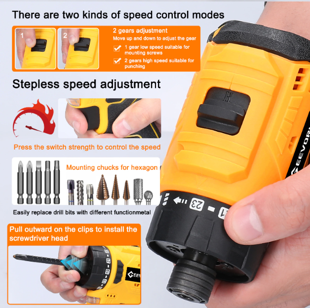 전동 드라이버 끝은 자석이 부착되어있어 피스를 고정할때 매우 편리하며, 2가지 속도 조절모드가 있어 상황에 맞게 사용 가능합니다.