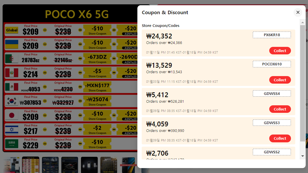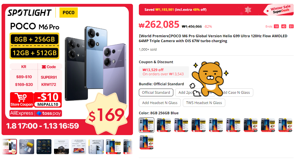 현재 알리익스프레스에서 POCO 출시기념으로 할인이벤트를 진행중이라 더욱 저렴하게 구입가능합니다. 플래그십 스마트폰을 자급제로 41만원에 구입할 수 있다니 놀랍지 않나요? 하지만 여기서 끝이 아닙니다! 위 이미지의 라이언이 가리키는 부위를 보시면 쿠폰&디스카운트가 있는데요. 저걸 눌러보면,