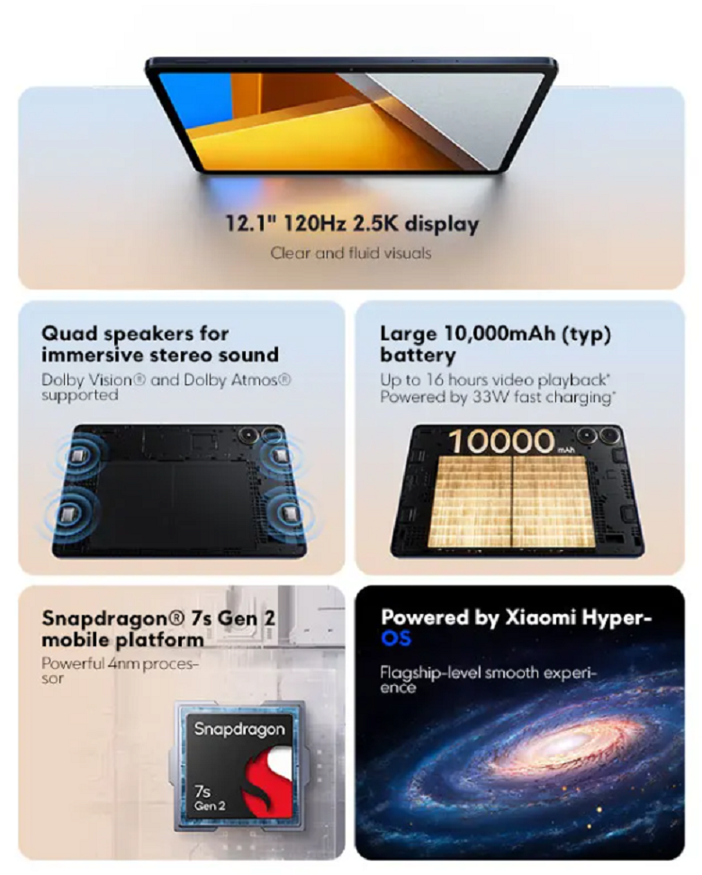 포코패드는 12.1인치 디스플레이로 POCO 스마트폰과 동일하게 120Hz 주사율도 지원합니다. CPU는 스냅드래곤 7s Gen2가 탑재되어있으며, RAM은 8GB, 내장모리는 치대 256GB까지 지원하고요.