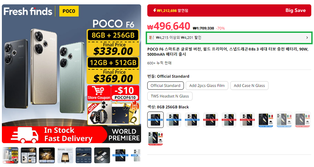 POCO F6도 마찬가지로 알리익스프레스에서 출시기념으로 할인이벤트를 진행중이며, 위 사진처럼 쿠폰을 적용해 얼리버드 특가로 구입이 가능합니다. 옵션에서 RAM과 내장메모리, 색상을 선택할 수 있으니, 놓치지마시고 원하는 옵션을 선택해 구입해보시기 바랍니다. 쿠폰 할인을 적용하면, 최대 30만원 후반대로 구입 가능하니, 할인 이벤트가 종료되기전에 구입하세요!